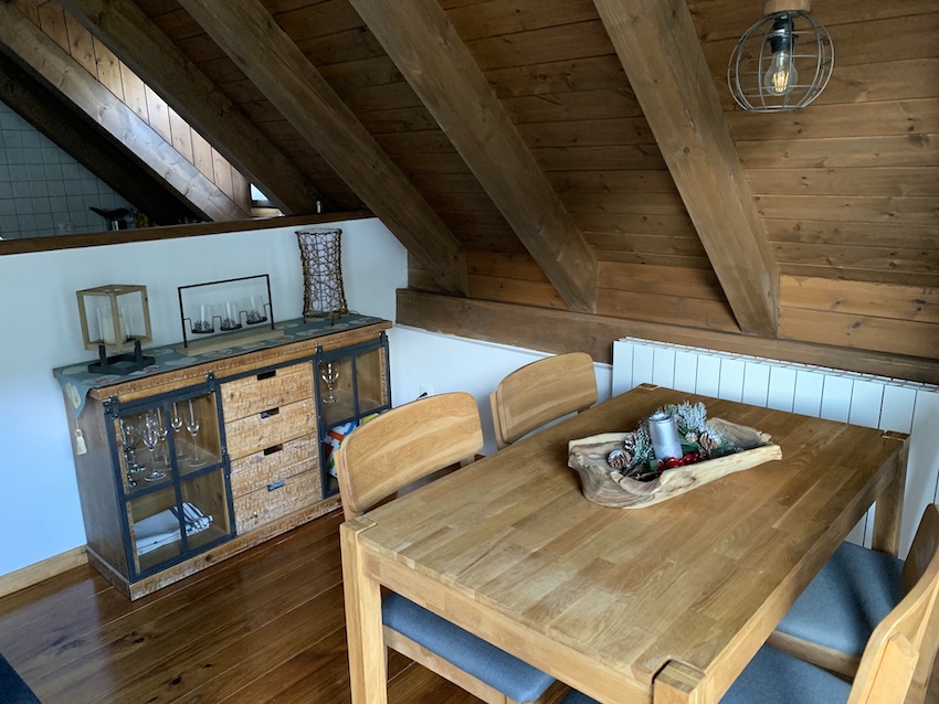 Encontramos este precioso Apartamento en Betlan al lado del Hotel Tierras de Aran. Se trata de un ático precioso que combina la madera, el verde de las montañas y la pizarra de su techo.