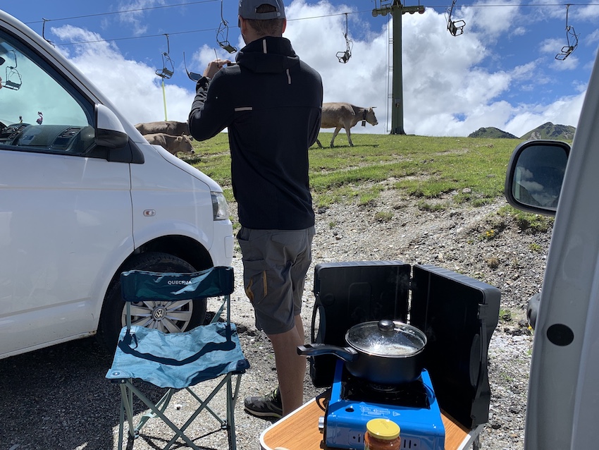 Dónde ir a comer también es algo muy personal. Aquí os muestro algunos de los que fuimos porque muchas comidas las hicimos en la furgo, con vistas y visitas inesperadas también!! Fue muy chulo ver las vacas libres pastorando tan de cerca 🙂