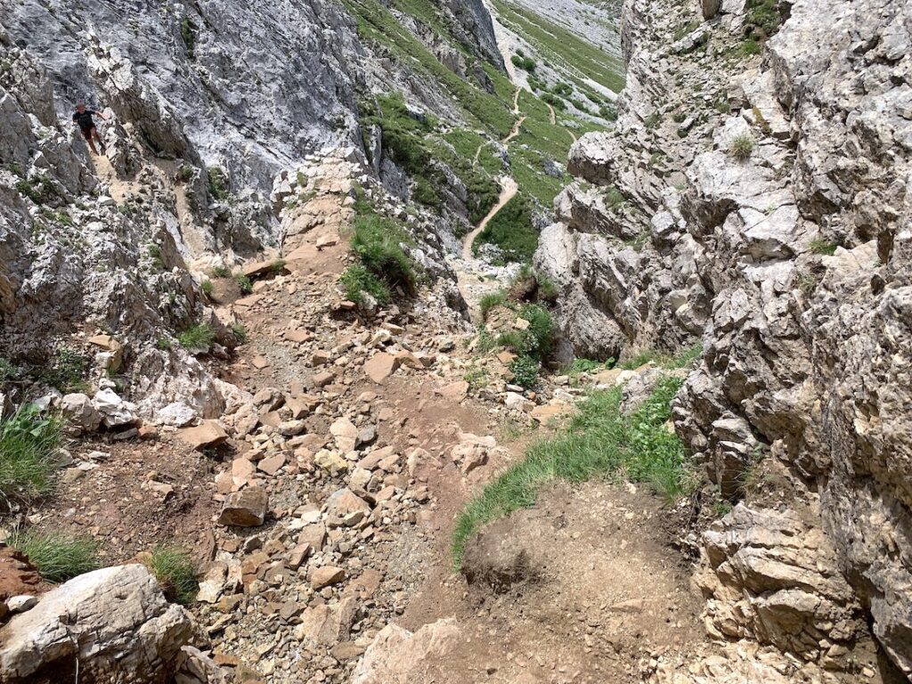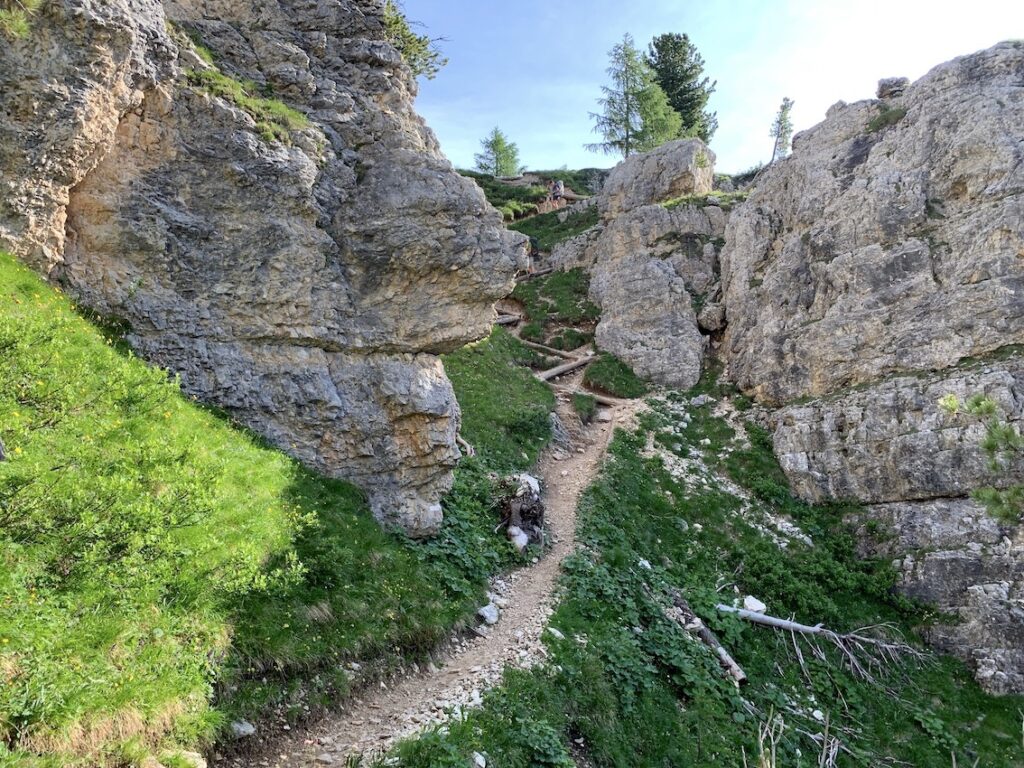 Desde aquí ya encaminamos el regreso al Passo Giau. Se puede ir por una amplia pista o por un sendero. Uno más sencillo pero un poquito más largo y otro más directo pero con una bajada más compleja.