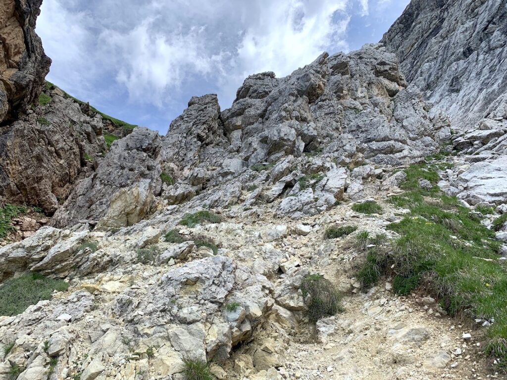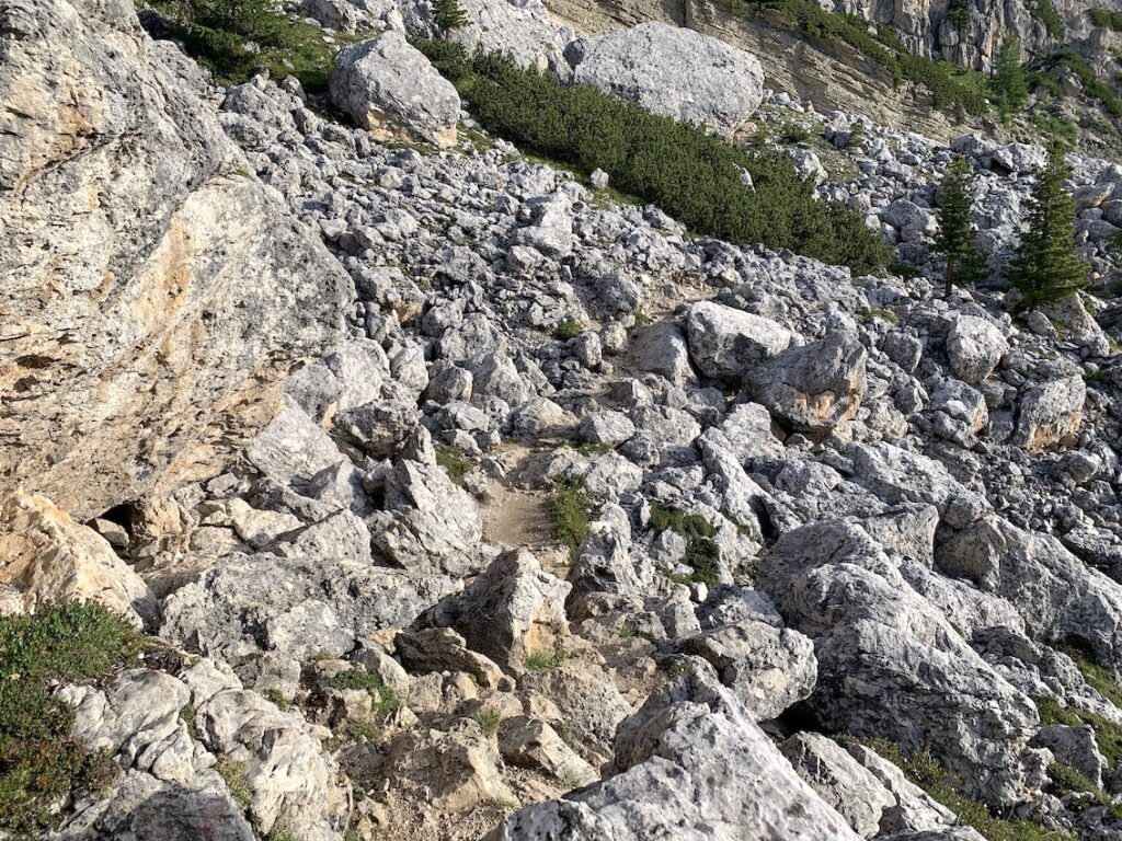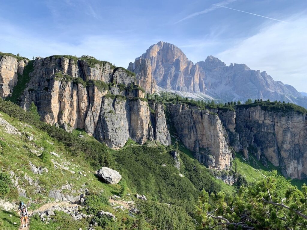 Después, llegará un tramo de bajada para luego tener frente a nosotros una pared que parece inaccesible y tras ella ya se ve la Torre Grande de Cinque Torri.