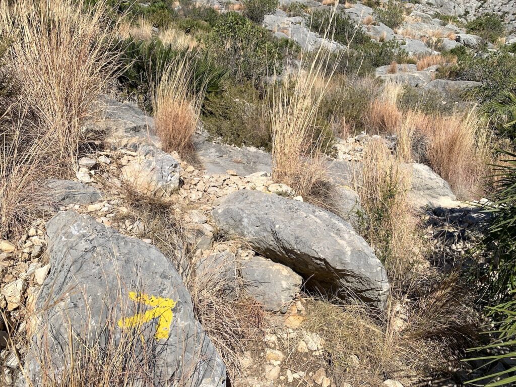 Iremos viendo marcas blancas y amarillas del PR-CV 415 que es una ruta circular a la Serra de Segària, conocida como el Gigante de Piedra Dormido.