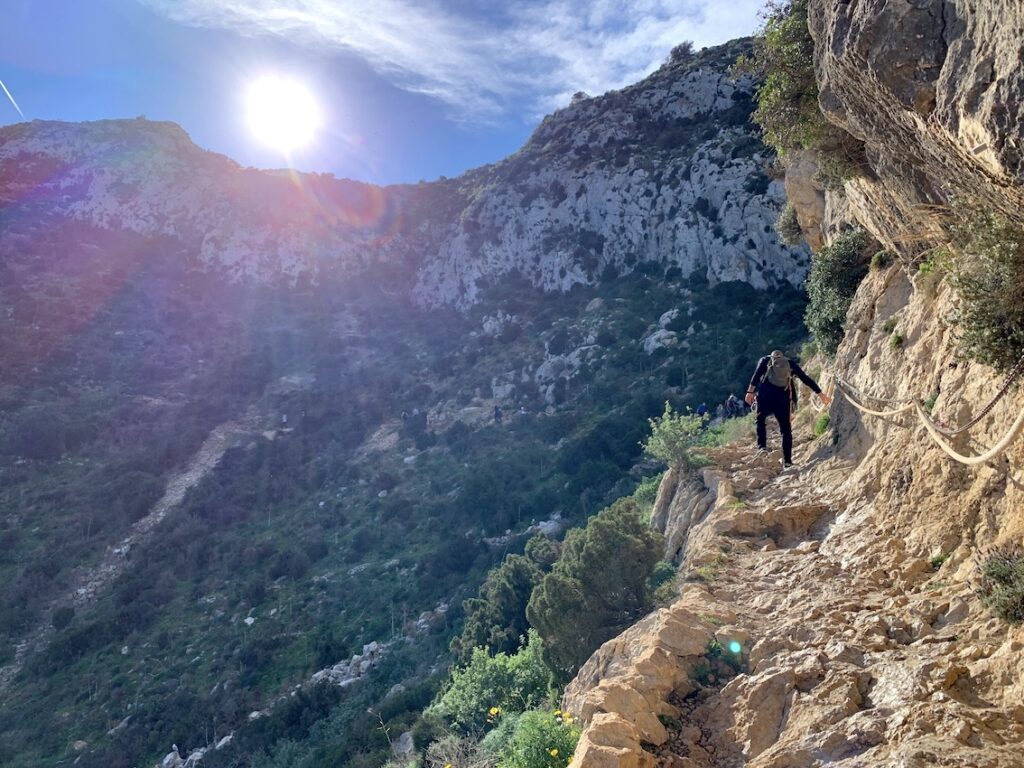 El último tramo a la cima es la parte más difícil .Todo es roca y el camino cuesta de ver. Verás que hay puntos rojos en las rocas que indican el camino y localizar con la vista las cadenas también ayuda a saber por dónde has de seguir.