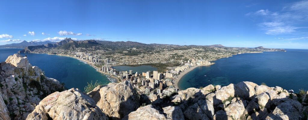 Desde aquí sólo veremos la parte sur de Calpe: su puerto, la playa de Cantal Roig, la bahía de Calpe, el Morro de Toix, Serra d’Oltà y más al fondo se ve algo del Parc Natural de la Serra Gelada.